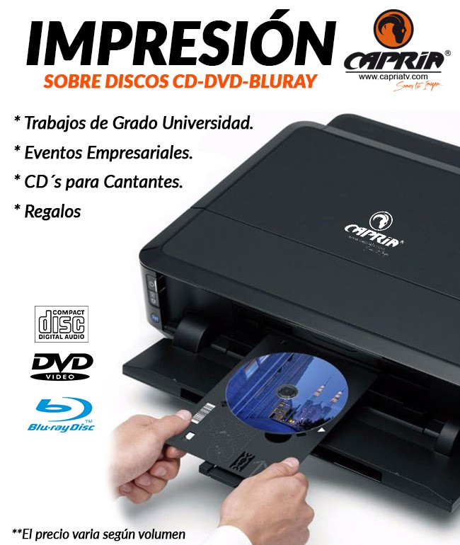 En Capria Publicidad te ofrecemos un servicio profesional y rápido de impresión de discos CD, DVD y Blu-ray con calidad fotográfica 💿✨. Utilizamos sistema de impresión sobre tinta, ideal para lograr colores vibrantes y acabados impactantes 🎨🔍.